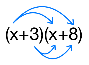 いつも通り分配法則をして計算すると真ん中の11xは、分配法則をしていく中でxと8をかけて、xと3をかけたものを足して11xになっていますよね。