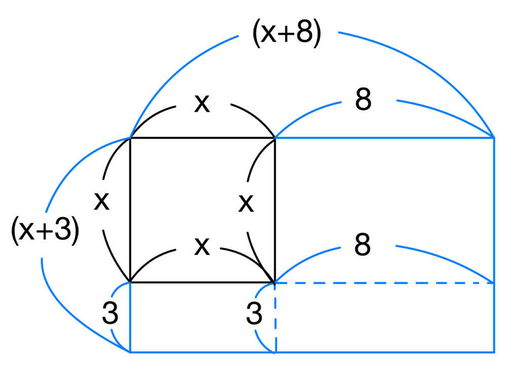 上の図は(x+3)(x+8)を長方形として表したものになります。